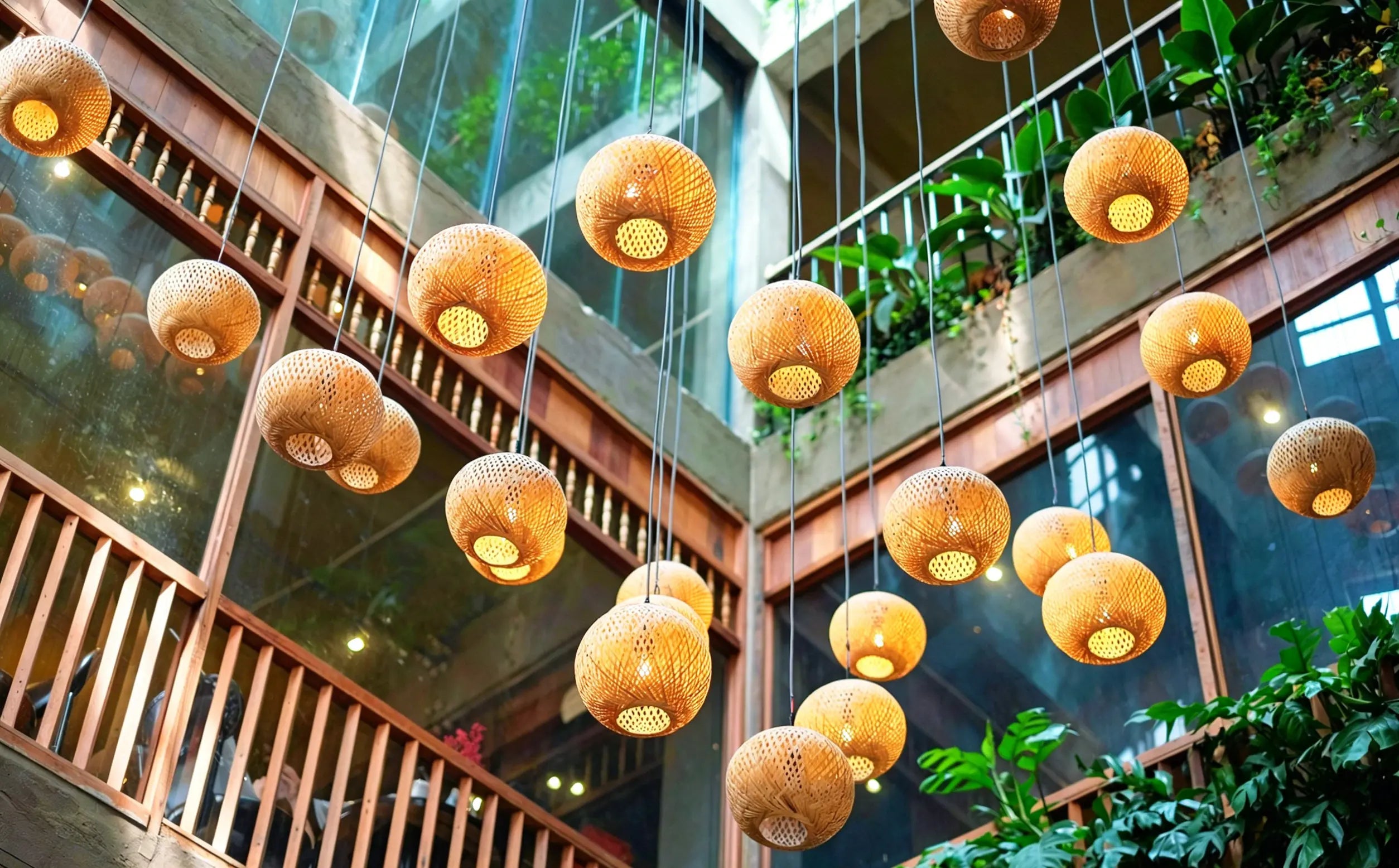 Step into this courtyard space wrapped in lush greenery, where warm amber rattan lights hang like scattered stars, blending the gentle warmth of natural wood with the vitality of plants—creating a tranquil, healing retreat in the heart of the city.